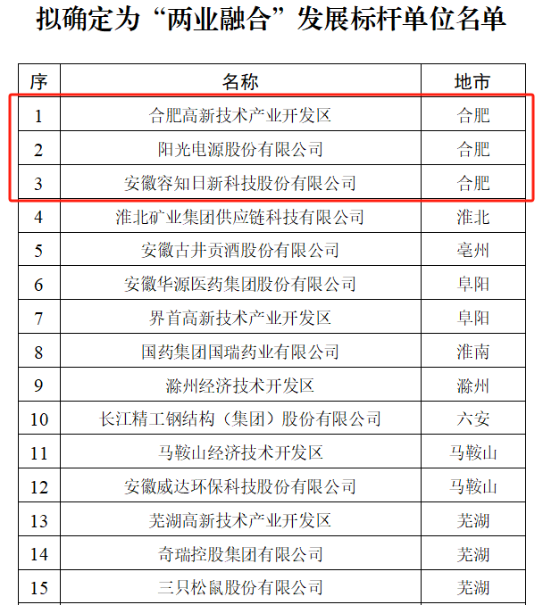 日前,安徽省发展和改革委员会公示了“省级先进制造业和现代服务业融合发展试点”评估结果,合肥高新技术产业开发区以及两家辖区企业阳光电源股份有限公司、安徽容知日新科技股份有限公司被认定为“两业融合”发展标杆单位。