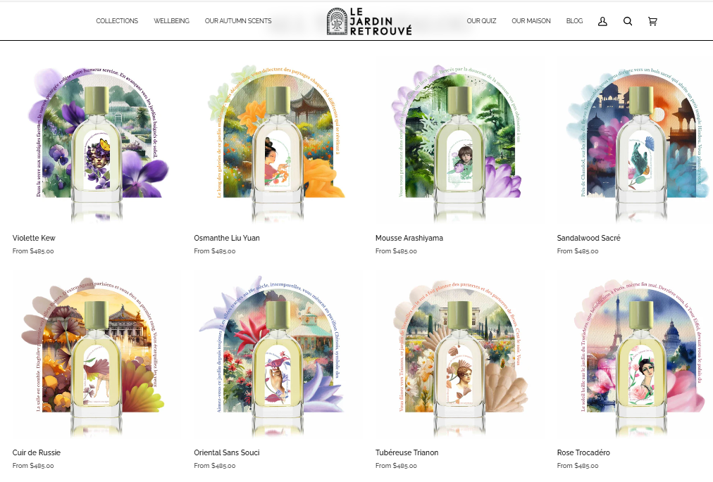 目前,LE JARDIN RETROUVE乐香杜唯的产品线包括香水、香薰蜡烛、身体护理等。其中,在售香水产品共有13款,包括Violette Kew、Oriental Sans Souci、Tubéreuse Trianon和Bois Tabac Virginia等。