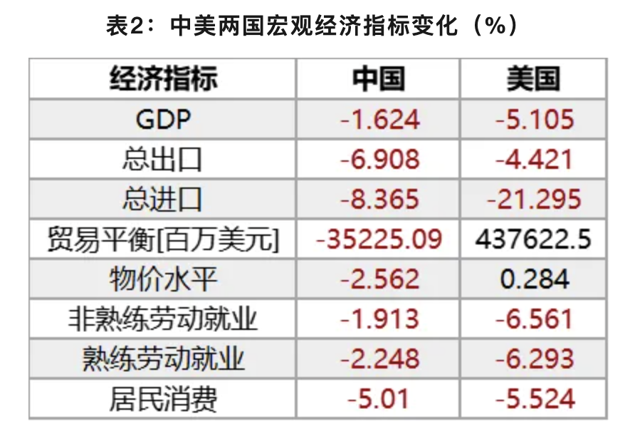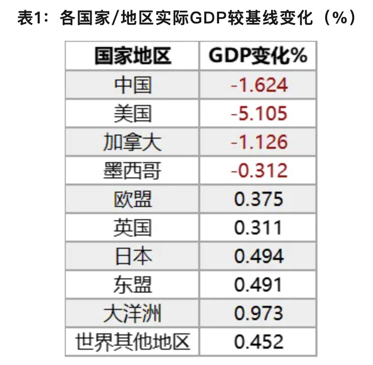 对于美国经济指标来说,其进口大幅削减,较基线下降约21%。美国的关税保护政策将拉高其国内物价水平,但整体涨幅较小,居民消费也有所收缩,劳动力就业市场受到较大影响,非熟练/熟练劳动就业下降均超过6%,可见关税贸易保护主义政策难以实现特朗普竞选所宣称的创造美国就业的目的,对于美国本国经济来说是损人不利己的政策行为。