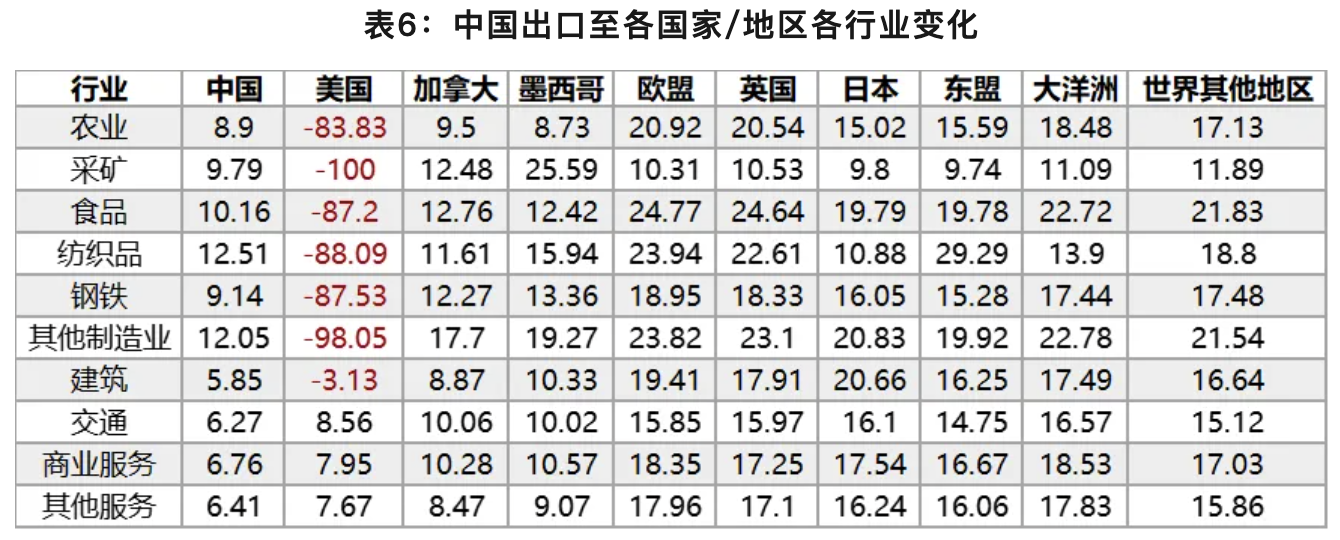从中国各行业的出口地区看,中国出口至美国的商品急剧下降,尤其是采矿、制造业的下降幅度最大,服务业出口则有小幅上升。中国出口减少的份额主要转移至欧盟等其他国家地区,尤其是纺织品、制造业等中国出口份额下降幅度较大的商品出口主要转移至欧盟、英国地区。