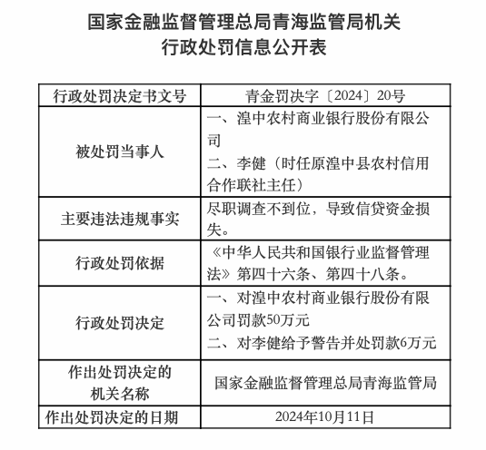 尽调不到位致信贷资金损失,湟中农商行被罚50万元