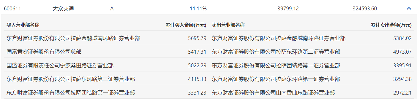 大众交通今日涨停,龙虎榜数据显示,上榜营业部席位全天成交4.36亿元,占当日总成交金额比例为13.43%。其中,买入金额为2.36亿元,卖出金额为2.0亿元,合计净买入3562.16万元。