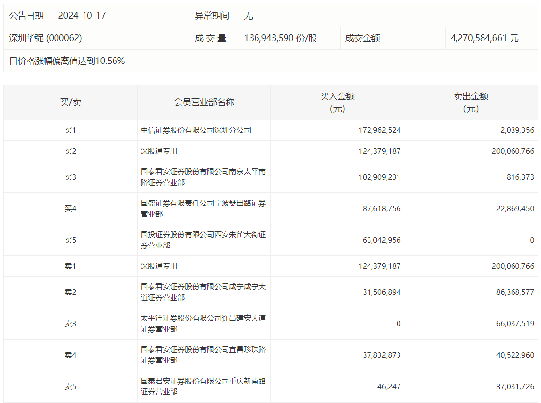 深圳华强今日涨停,龙虎榜数据显示,上榜营业部席位全天成交10.76亿元,占当日总成交金额比例为25.2%。其中,买入金额为6.2亿元,卖出金额为4.56亿元,合计净买入1.65亿元。