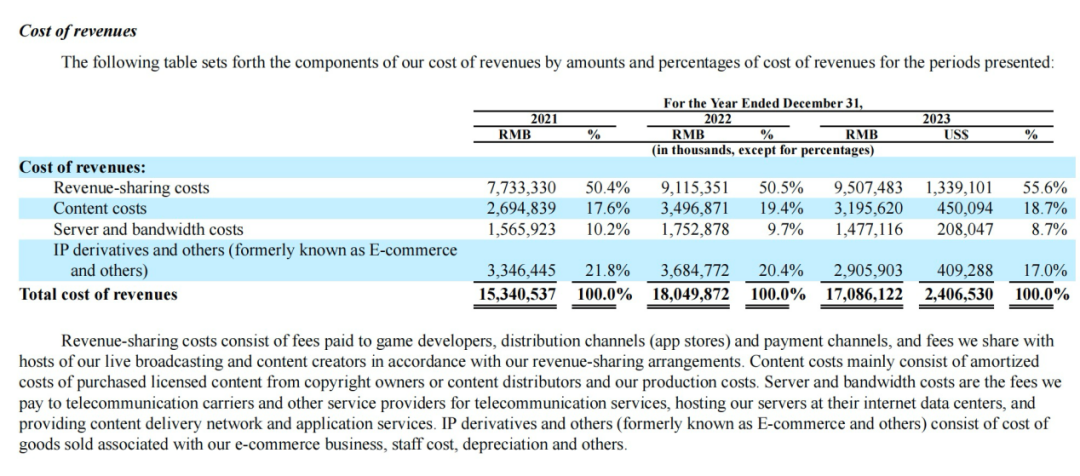 根据财报,B站的收入成本分为四个部分:收入分成成本、内容成本、服务器和带宽成本,以及IP衍生品和其他支出。在这些成本项中,带宽成本实际上是占比最低的,最大的支出是收入分成成本。这一项包括平台对开发者、分销渠道(如应用商店)和支付渠道的补贴,以及与直播主和内容创作者的收入共享费用。