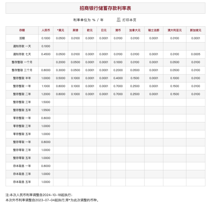 10月18日,招商银行官网显示,招行于10月18日下调了人民币存款利率,其中活期存款利率下调至0.1%,定期三个月期、半年期、一年期、二年期、三年期和五年期分别为0.80%、1.00%、1.10%、1.20%、1.50%和1.55%。