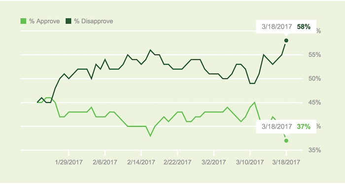在美国,新总统上任的前几个月通常被视为与选民的“蜜月期”,此时支持率相比起任期其它阶段通常会较高。不过,根据盖洛普民调,特朗普1月20日上任时,其支持率就只有45%左右,不到一个月该数字就降到了38%,到3月18日降到了37%。