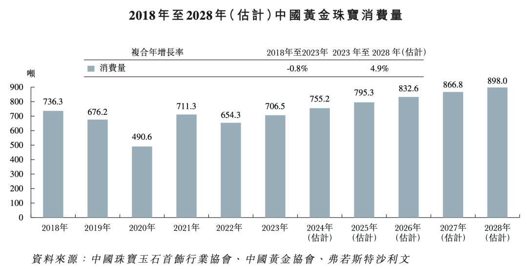 实际上,我国黄金珠宝消费量波动较大,2023年的消费量为706.5吨,不及2018年的736.3吨,中间多个年份的销量都处同比下滑趋势。2018年—2023年的年复合增长率为-0.8%,常年的波动也让2023年—2028年的4.9%年复合增长率预期显得过于乐观。