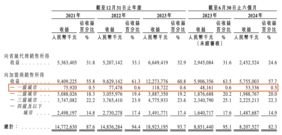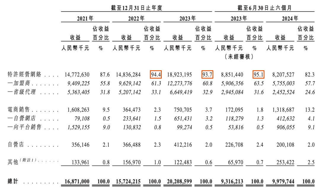 其中,特许经营网络渠道营收占比长期保持在90%以上。2024年上半年数据显示,该占比从2023年的95.1%降低到82.3%,显然是在有意识地作出调整。