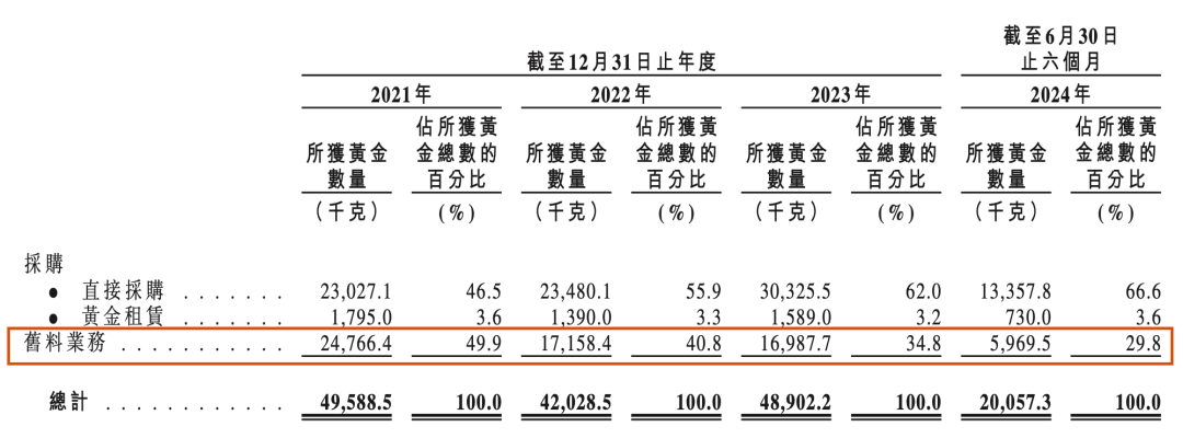 旧料业务活动,是指以旧换新业务。梦金园通过以旧换新的形式,从消费者处收购旧料作为原料。2020年,梦金园来自旧料业务兑换获取的黄金量一度达到67.56%,后续几年降至30%左右。