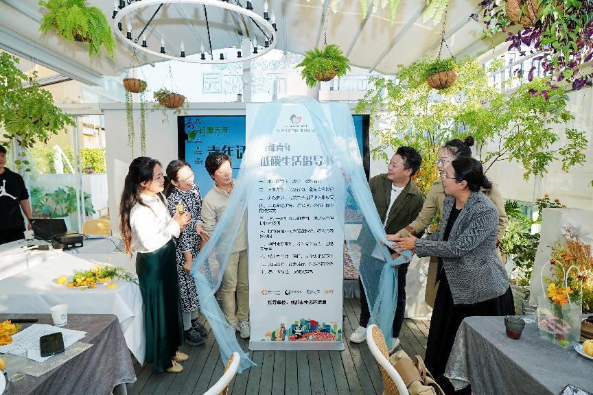 在主题分享与观点互动后,“碳惠天府”平台联合现场青年嘉宾共同为“成都青年低碳生活倡导书”揭牌并合影展示,赢得阵阵喝彩。现场青年表示,坚持环保低碳的的生活方式更能彰显年轻人的活力与向上,对于日益严峻的气候和资源挑战,具象化的生活表现,落实到每一个人身上,都有程度不同的感知,“改变需要从最基础的小事做起,坚持公共交通出行、垃圾分类、出门自带杯减少一次性用品使用等等。”