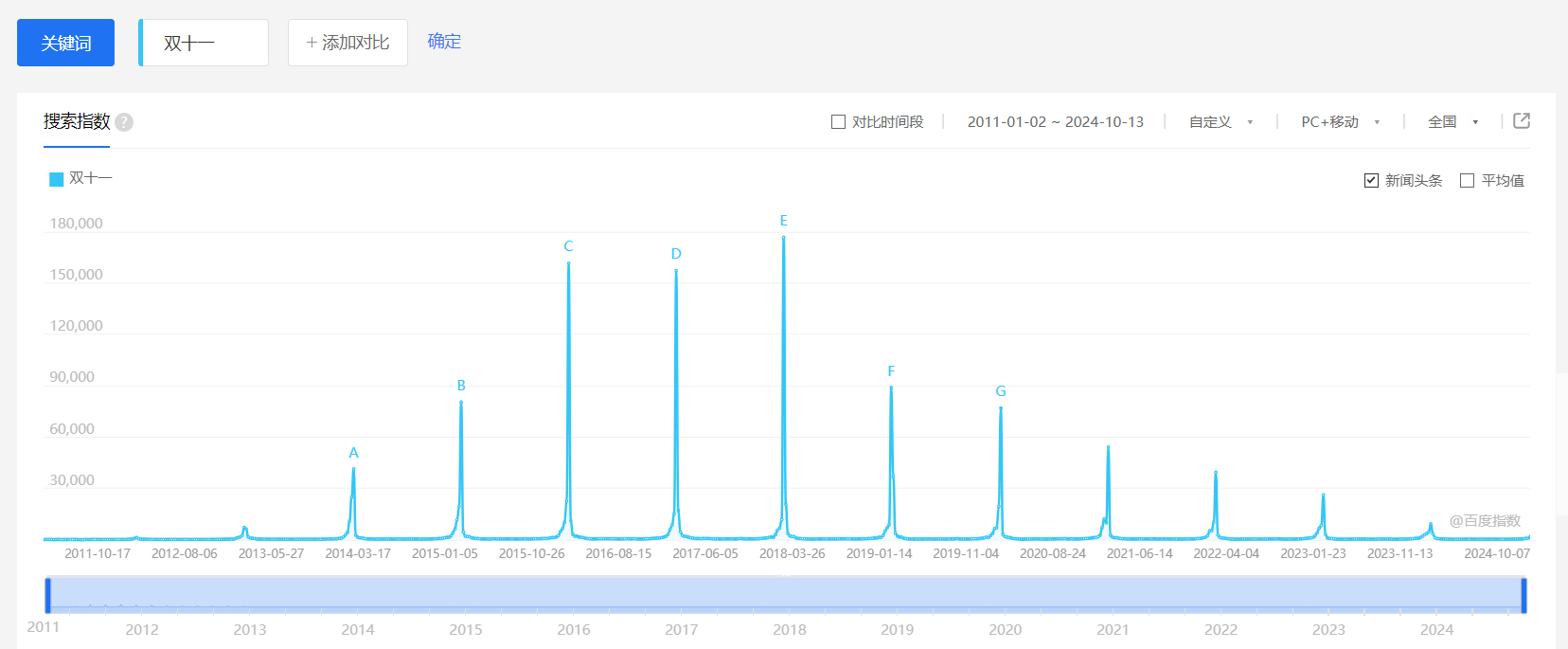 按照百度指数,双十一的热度在2016至2018年达到高峰后,从2019年开始持续下滑,近两年来关于双十一的搜索热度甚至倒退回了2013年左右的水平。
