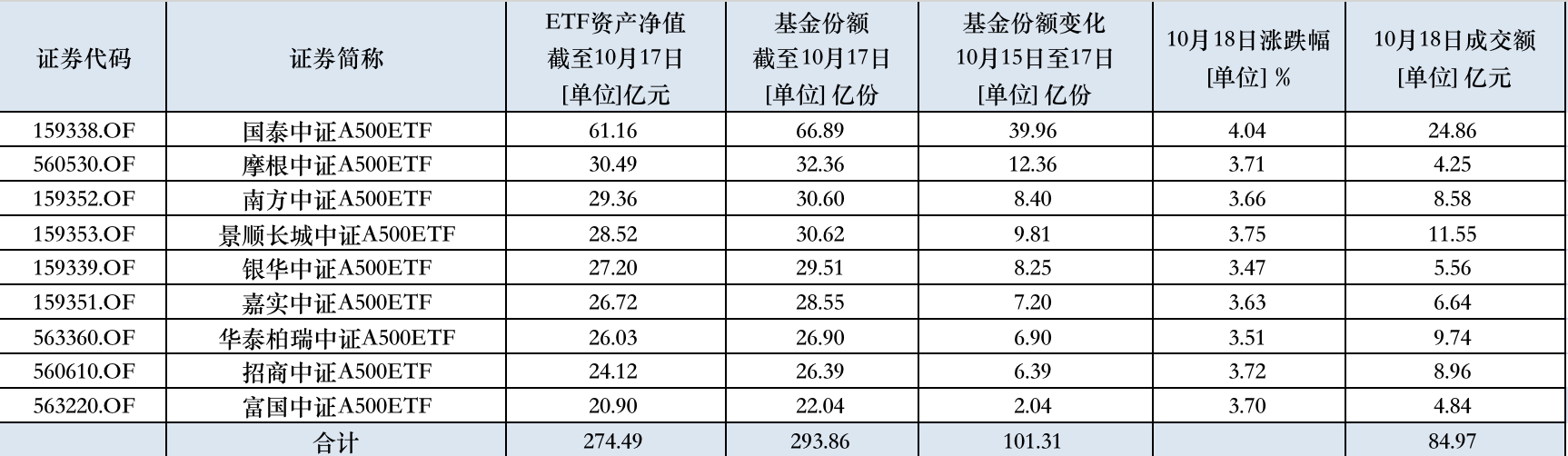 10只中证A500ETF上市以来(10月15日至10月17日),均获得净申购,最新规模和份额合计为274.49亿元、293.86亿份,较成立时分别增长了37.25%、46.93%。