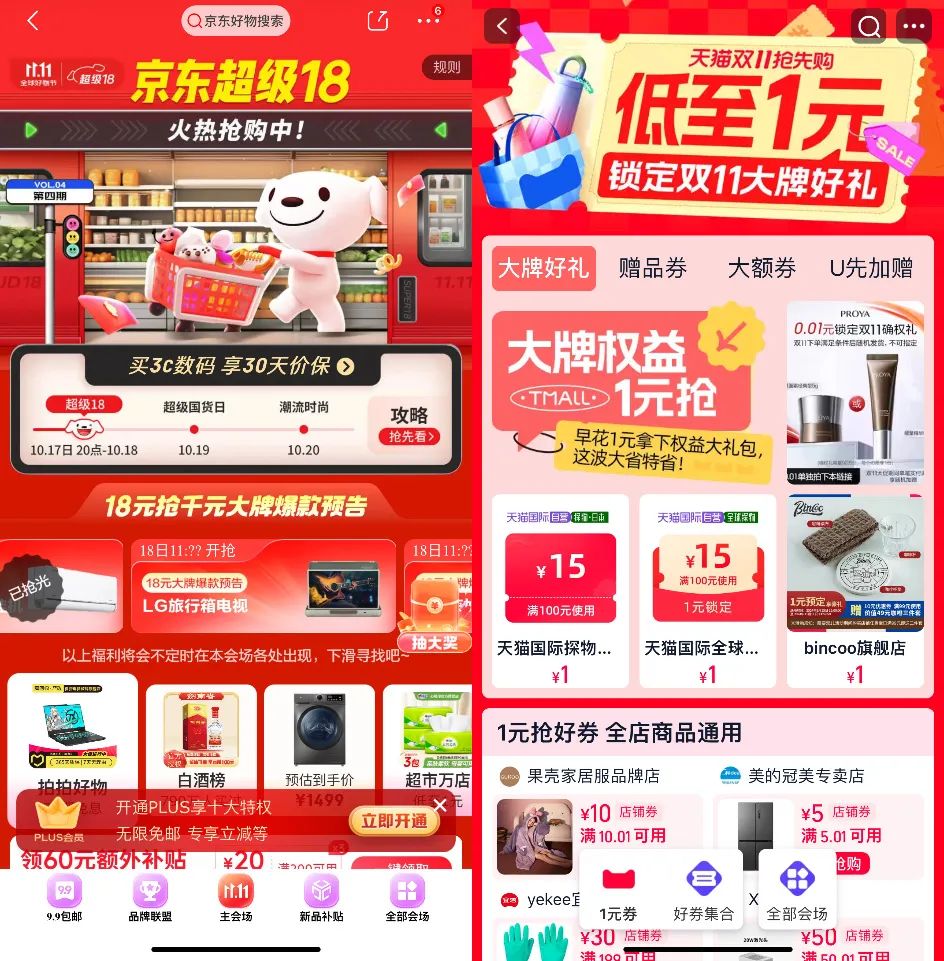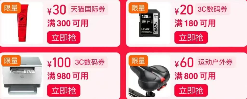 淘天则在3C、家电品类等京东优势项目上,发放满980元减100元的“3C数码券”、满2980元减300元和满5980元减600元的“家电超值券”等多个档位优惠。