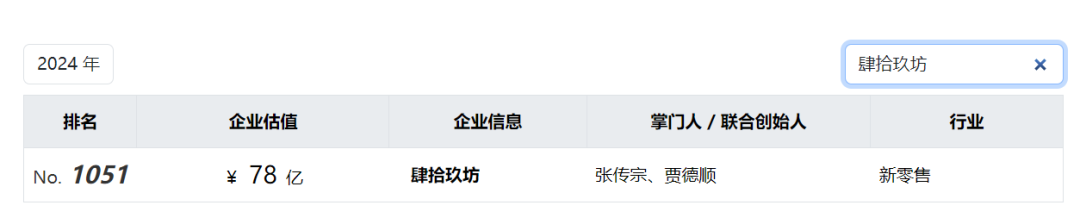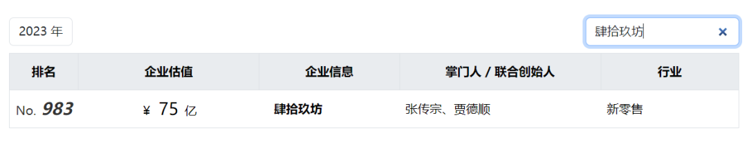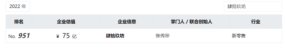 2021年,肆拾玖坊以70亿估值位列该榜单745名。2022年,公司估值上升至75亿,排名却下滑至951名。