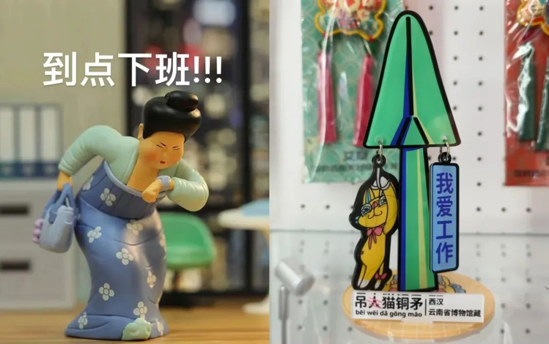 “心理疗愈”已经成为博物馆文创的一大功能,例如,以石观音菩萨立像为原型的拿捏·胖手毛绒玩具、有我则灵系列玩偶以一股神秘念力安抚着焦虑的年轻人;云南省博物馆推出的吊人猫铜矛立牌、陕西历史博物馆超活化仕女日常摆件,都以360度无死角的方式演绎了打工人的精神状态,流行折射出的是当代人寻求解压的情绪需求。