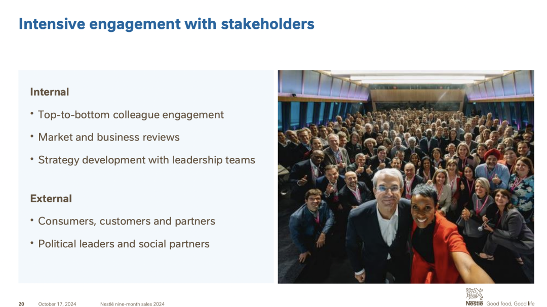 首先他阐述了雀巢的优势,包括富有激情且目光长远的团队、全球和本地标志性品牌的组合、领先的行业地位和产品、难以匹敌的地理覆盖范围和规模、消费群体中的高渗透率、强大的创新生态系统、可持续发展领域的领导地位。