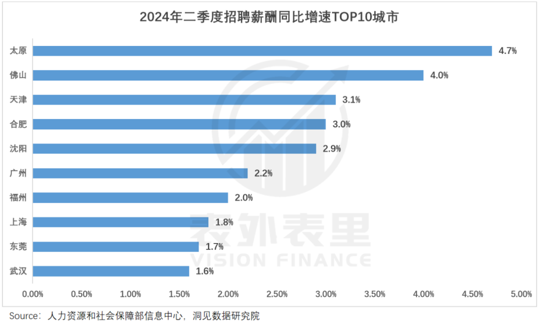 二季度涨薪TOP10城市中,默默无闻的太原摘得了榜首,合肥、沈阳、武汉等城市也表现不俗,反倒是经济发达的北京、深圳榜上无名。