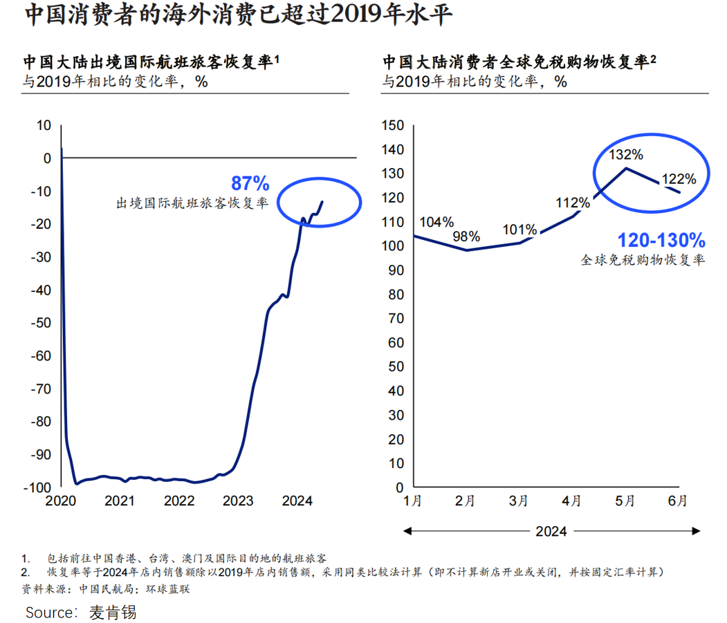 麦肯锡最新报告甚至显示,内地消费者赴海外免税购物情况,已经恢复到了2019年水平的120%-130%。