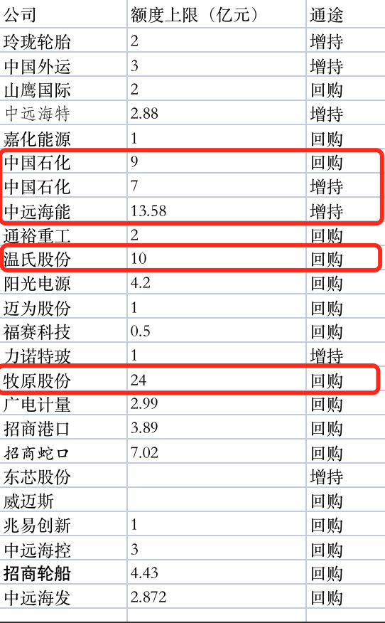 据记者统计,第一波有23家公司发布相关信息。其中额度超过10亿元的有中国石化、中远海能(600026.SH)、温氏股份、牧原股份。