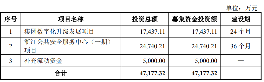 从此前安邦护卫公布的募资用途来看,主要用于集团数字化转型和浙江公共安全服务中心(一期)项目。值得注意的是,该两个项目均不是用来扩大现有经营规模,主要是对现有的经营情况补充升级。