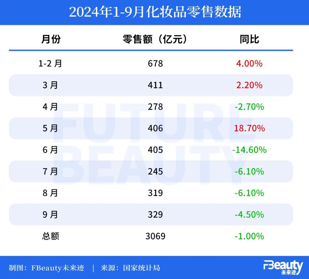 今日(10月18日),国家统计局发布最新化妆品零售额数据,前9月化妆品行业总计零售3069亿元,同比下滑了1%,自6月以来已经连续下滑4个月。