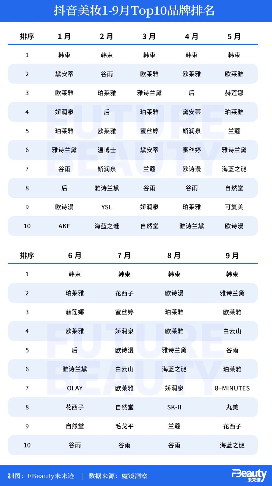 而在抖音平台,韩束以超过47亿GMV形成断层优势,连续9个月成为抖音美妆全品类第一,Top3的其他两个品牌分别有黛安蒂、谷雨、欧莱雅、珀莱雅、赫莲娜、后、花西子、蜜丝婷和雅诗兰黛上榜,但韩束一直“遥遥领先”。