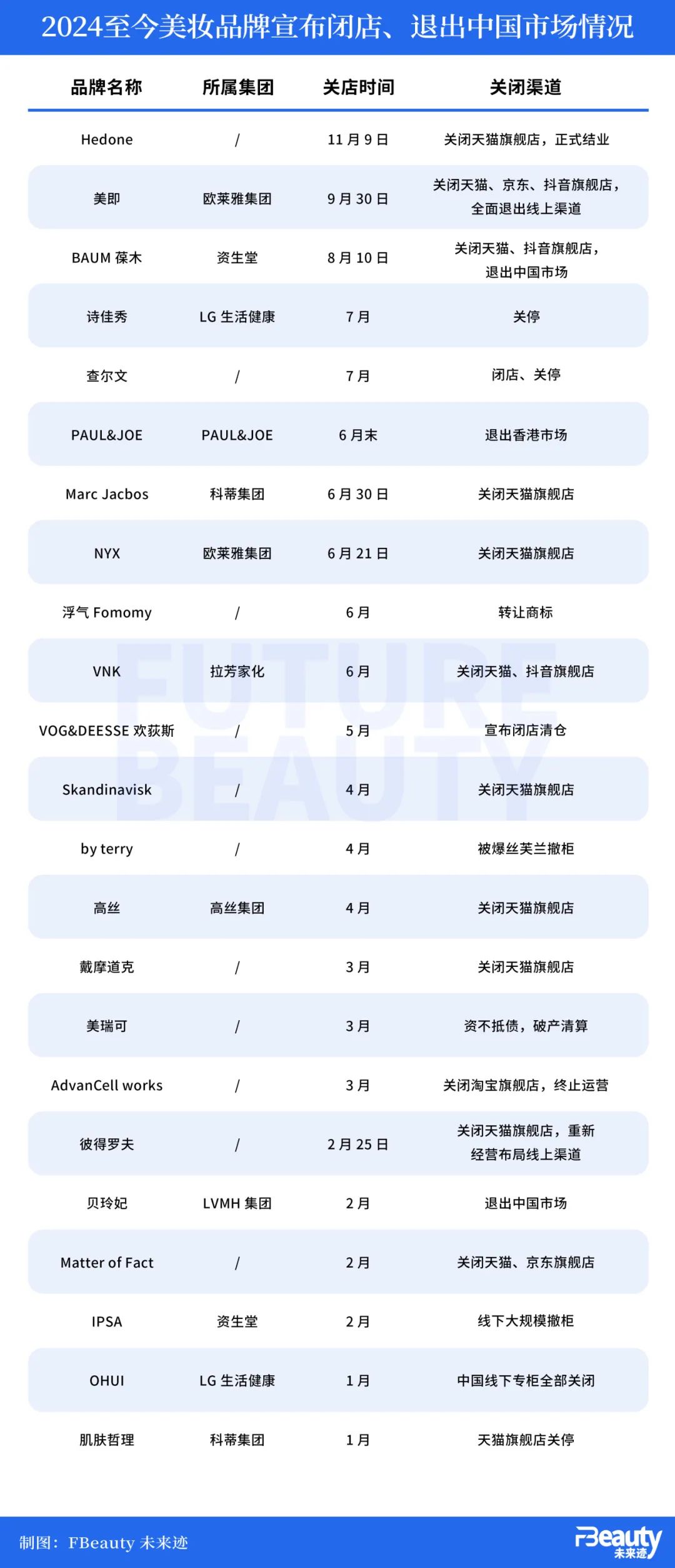 与此同时,市场阵痛的现象已经越来越明显。《FBeauty未来迹》不完全统计发现,截至今年10月,已经有23个品牌宣布关闭门店、退出中国市场或品牌倒闭,其中除了浮气fomomy、HEDONE、VNK等中小国货彩妆品牌之外,也不乏LVMH、资生堂、科蒂、LG生活健康、欧莱雅等外资大集团的品牌。
