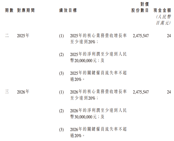 仅就2024年的业绩承诺来看,标的公司核心业务营收增长率至少达到20%;第四季度,标的公司净利润至少达到600万元,或者,公司2027年一季度净利润同比增长不低于20%,此外;标的公司要确保2024年的关键雇员流失率不超过20%。