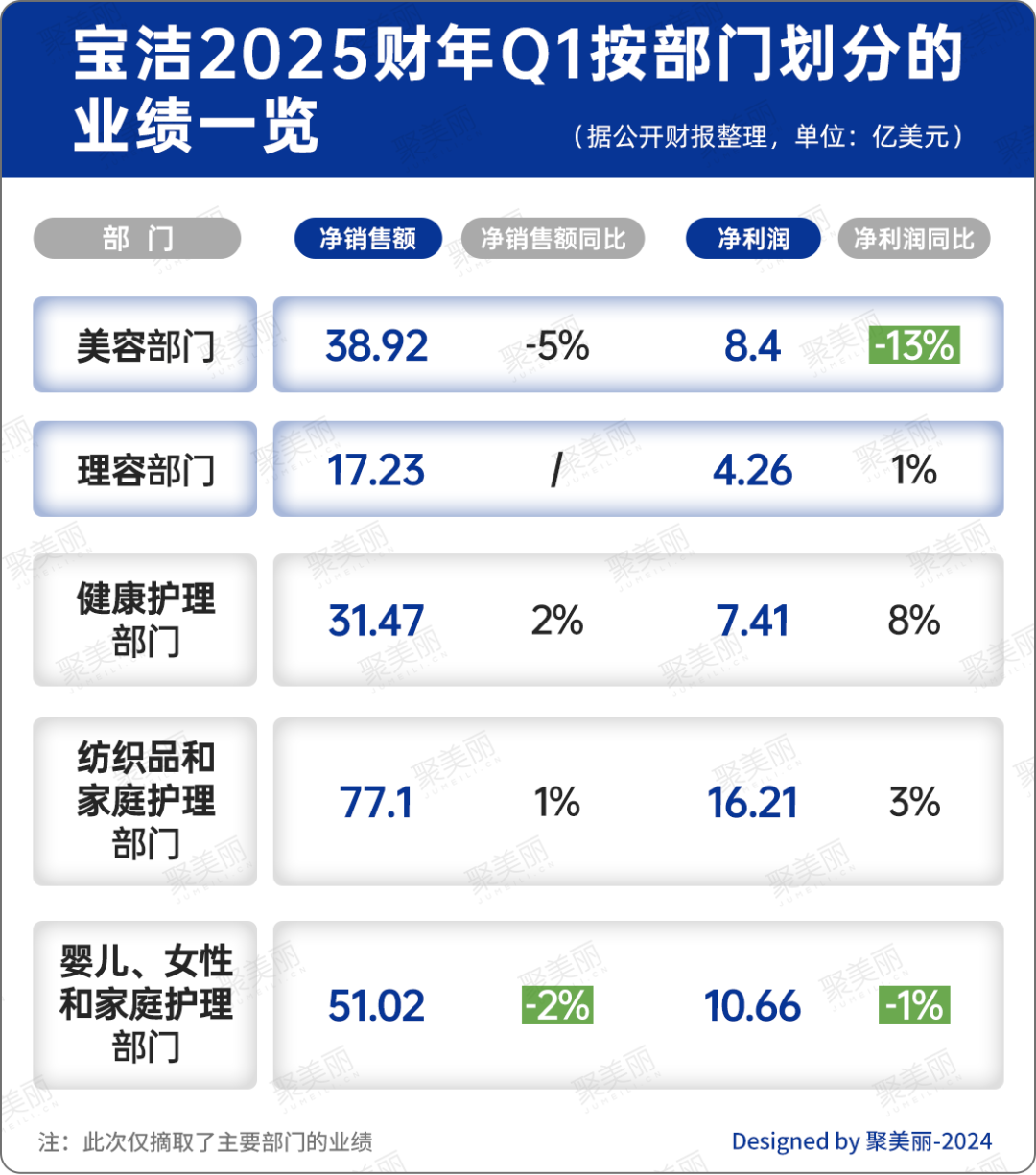 具体来看,美容部门,婴儿、女性和家庭护理部门的净销售额、净利润呈双跌,尤其是美容部门利润跌幅呈两位数。