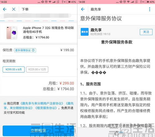 以租赁32G的iPhone 7来计算,租期可选择6个月和12个月,租金分别是每个月299元和229元,租满分别是1794元和2748元。此外,用户还需要强制购买一项意外保障服务,由第三方财产保险公司承保。保费会根据容量版本和租期而相应有所增加,32G版本租半年需要199元,一年需要299元意外保障服务费。也就是说,32G的iPhone 7租半年总共花费1993元,租一年需要3047元。
