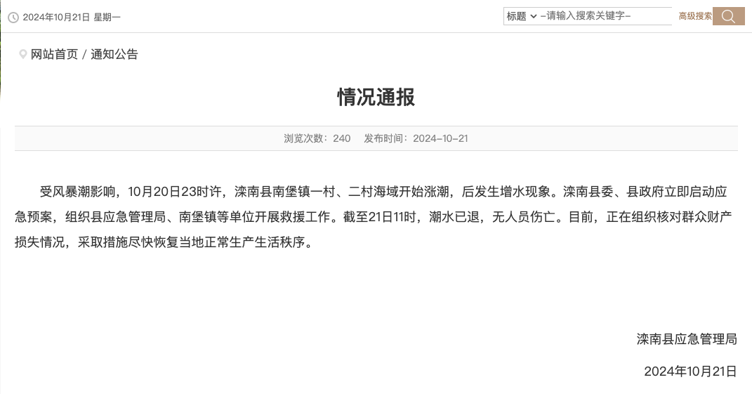 10月21日,滦南县应急管理局通报,受风暴潮影响,10月20日23时许,滦南县南堡镇一村、二村海域开始涨潮,后发生增水现象。滦南县委、县政府立即启动应急预案,组织县应急管理局、南堡镇等单位开展救援工作。截至21日11时,潮水已退,无人员伤亡。目前,正在组织核对群众财产损失情况,采取措施尽快恢复当地正常生产生活秩序。