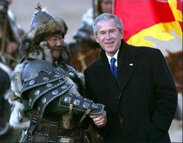 ▲2005年11月21日,小布什成为首次访问蒙古国的美国总统,这张照片让人感觉很“穿越”,如果时光倒退七百多年,小布什的祖先可能正因为蒙古大军的到来而瑟瑟发抖