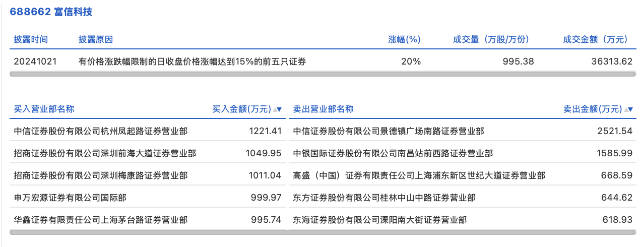 10月21日,富信科技今日涨停,龙虎榜数据显示,上榜营业部席位全天成交1.13亿元,占当日总成交金额比例为31.17%。其中,买入金额为5278.11万元,卖出金额为6039.67万元,合计净卖出761.55万元。