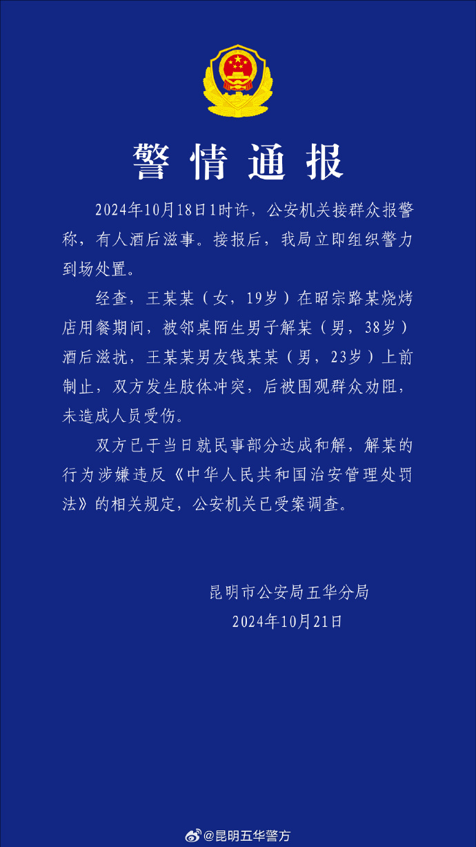 昆明市公安局五华分局10月21日通报,10月18日1时许,公安机关接群众报警称,有人酒后滋事。经查,王某某(女,19岁)在昭宗路某烧烤店用餐期间,被邻桌陌生男子解某(男,38岁)酒后滋扰,王某某男友钱某某(男,23岁)上前制止,双方发生肢体冲突,后被围观群众劝阻,未造成人员受伤。双方已于当日就民事部分达成和解,解某的行为涉嫌违反《中华人民共和国治安管理处罚法》的相关规定,公安机关已受案调查。