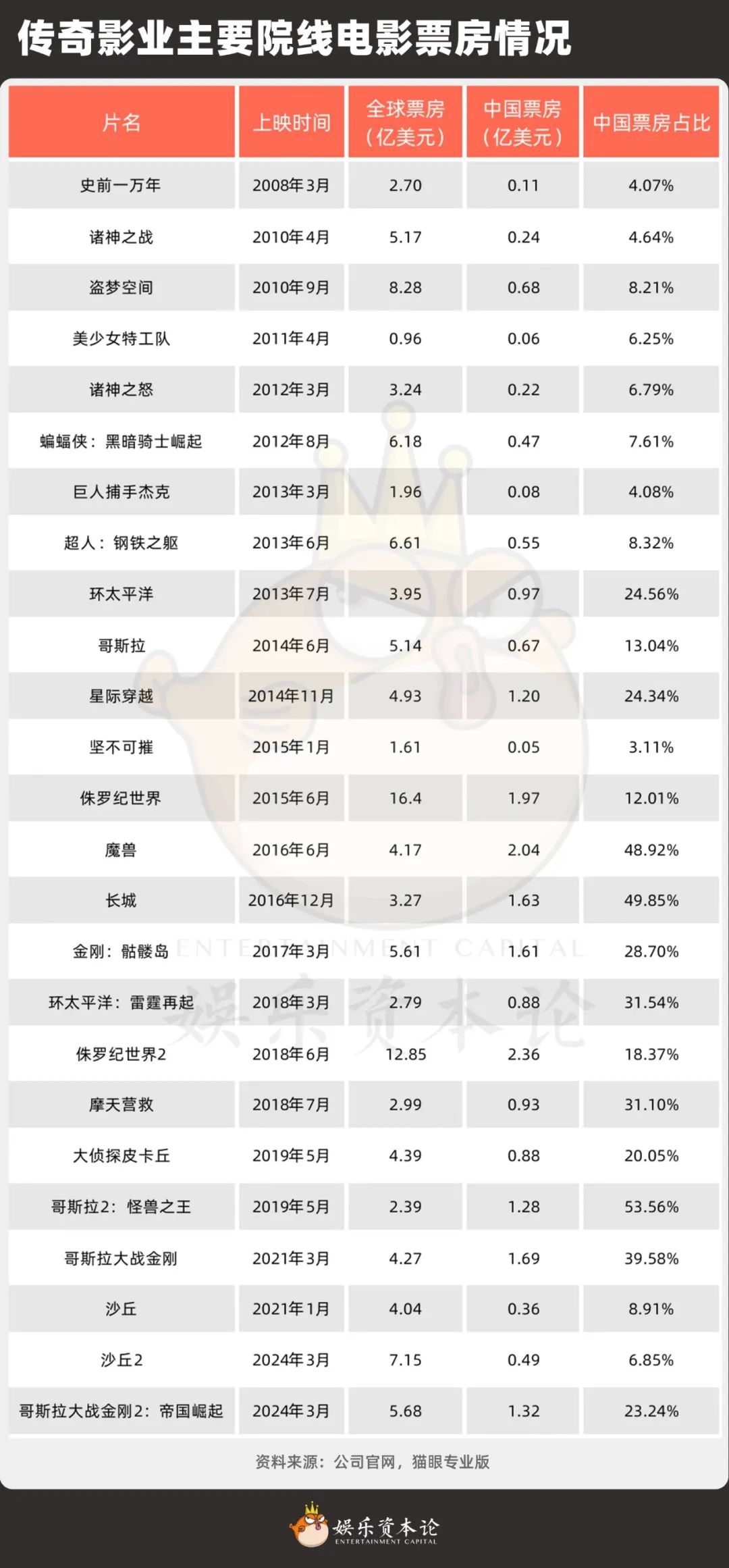 和万达合作的那些年甚至是传奇作品最少、表现最差的日子。2016年的《魔兽》位列全球第18名,而《长城》则在第27名。变成万达在美国的“留守儿童”、回归好莱坞怀抱后,传奇的境遇反而又柳暗花明。