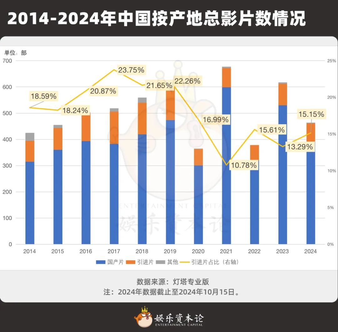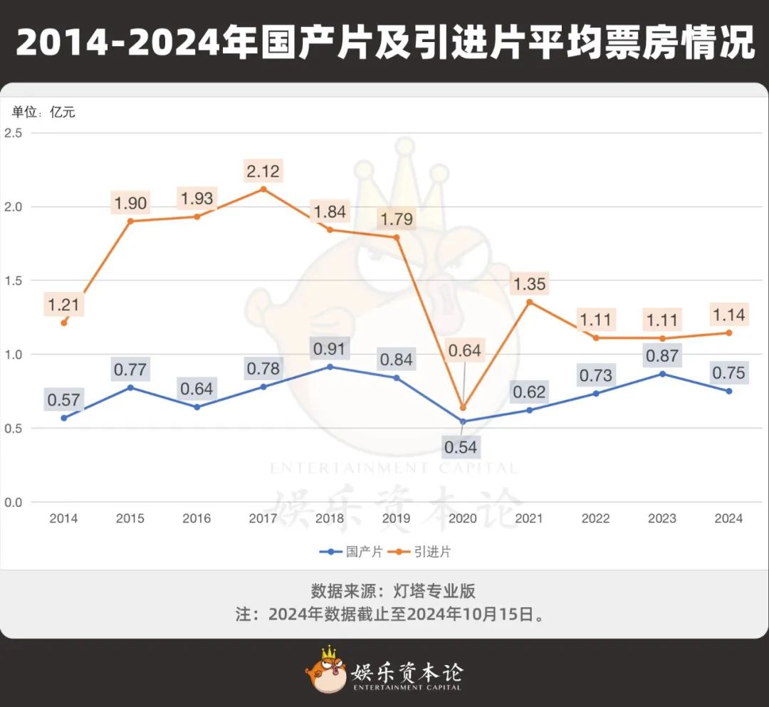 平均票房方面,由于引进片经过严格筛选,而国产片基数相对较大,引进片的平均票房领先于国产片。但差距正在缩小——这同样表明,进口片正在失去优势。