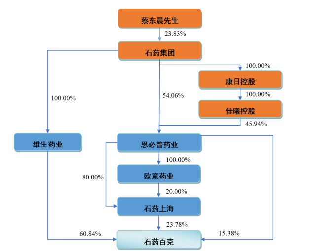 目前石药百克的股权结构为维生药业持股60.84%、石药上海持股23.78%、恩必普药业持股15.38%。蔡东晨通过石药集团控制维生药业、恩必普药业和石药上海,为石药百克的实际控制人。