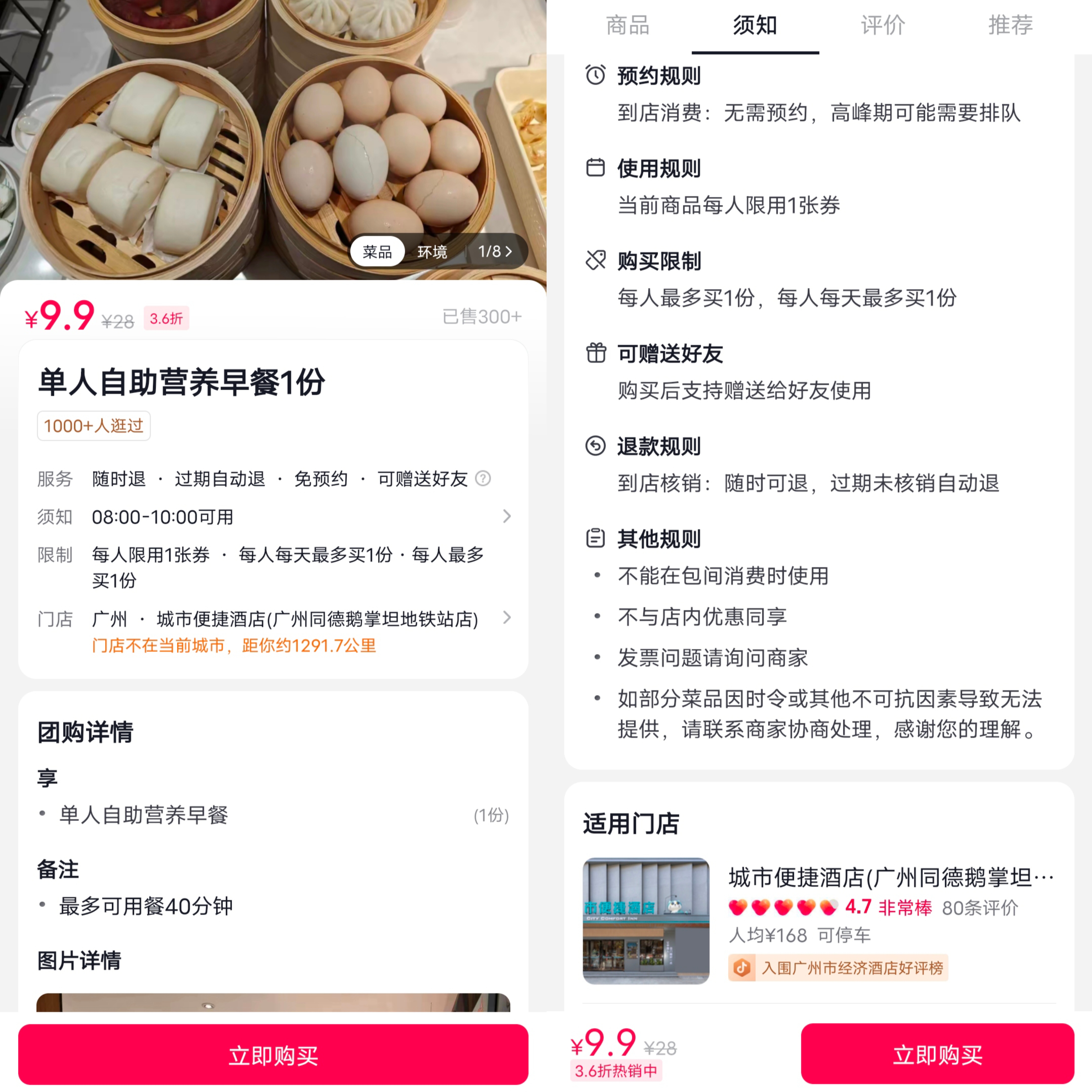 消费者只需花费9块9元在抖音下单,就可在每天早上8点到10点之间尽情享用,最多可用餐40分钟。这款产品原价是28元,现在的折扣是3.6折,力度的确非常之大。