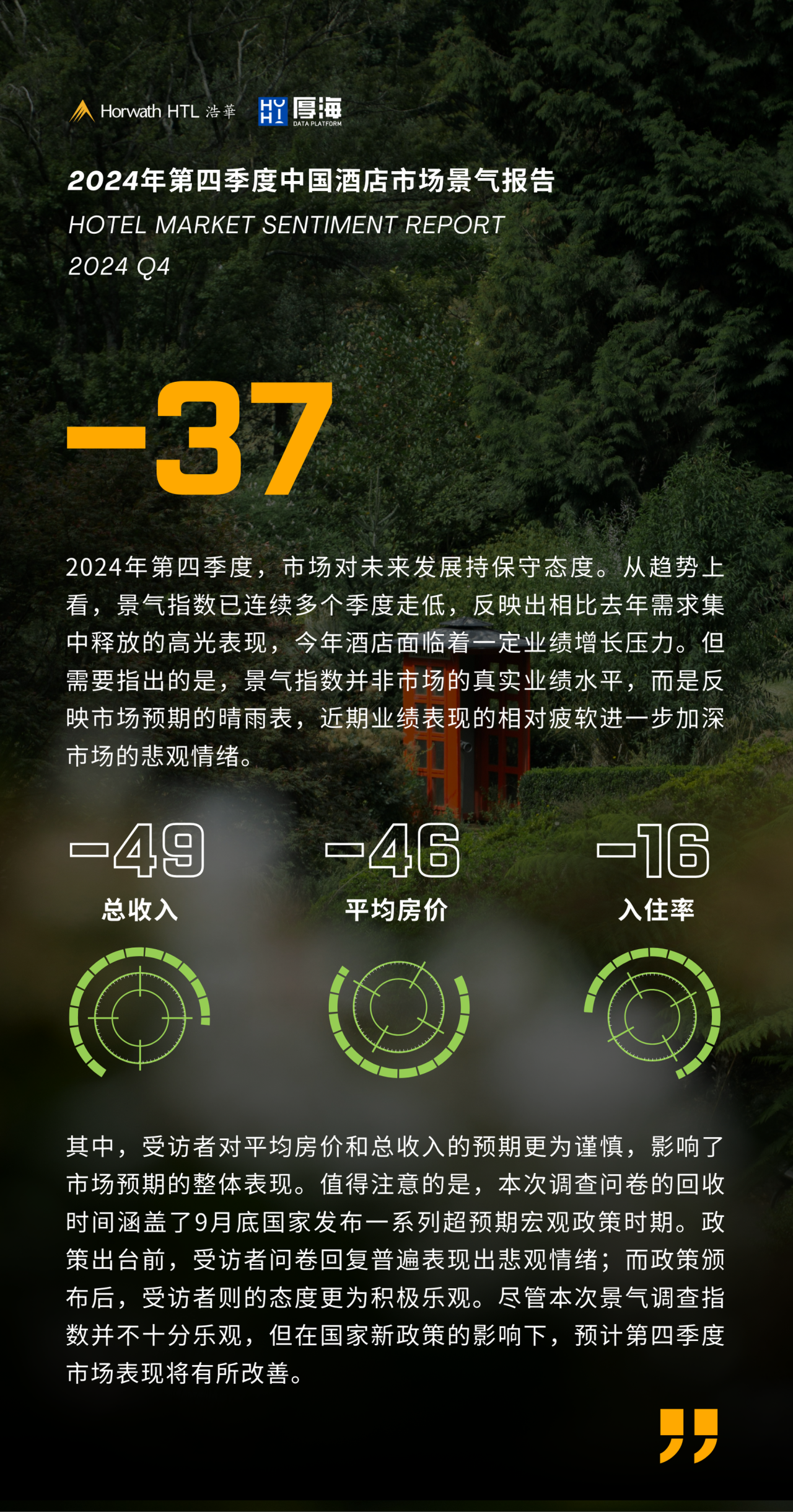 厚海数据平台发布的《2024年第四季度中国酒店市场景气报告》显示,今年第四季度,市场对未来发展持保守态度。从趋势讲,景气指数已经连续多个季度走低,反映出相比去年需求集中释放的高光表现,今年酒店面临着一定业绩增长压力。