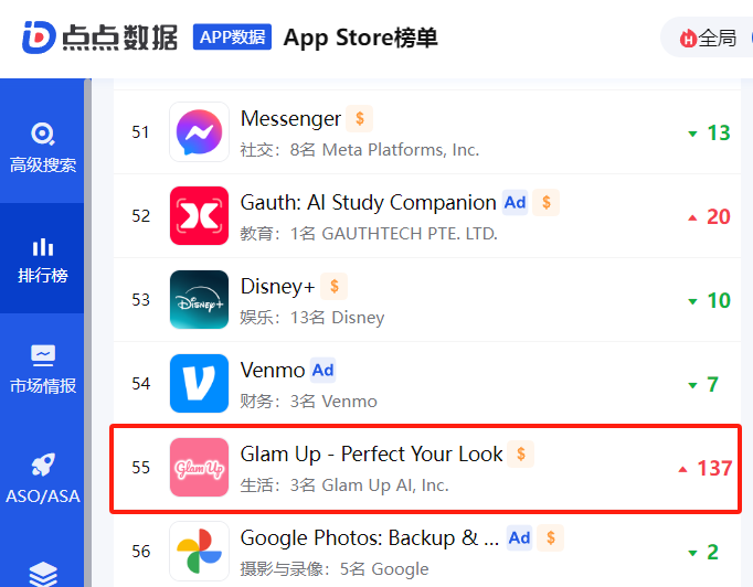 在10月21日(北京时间)的美国App Store免费应用榜单上,Glam Up较前一日排名上升137位,来到了应用总榜排名第55的位置,同时位列生活应用榜第三位。