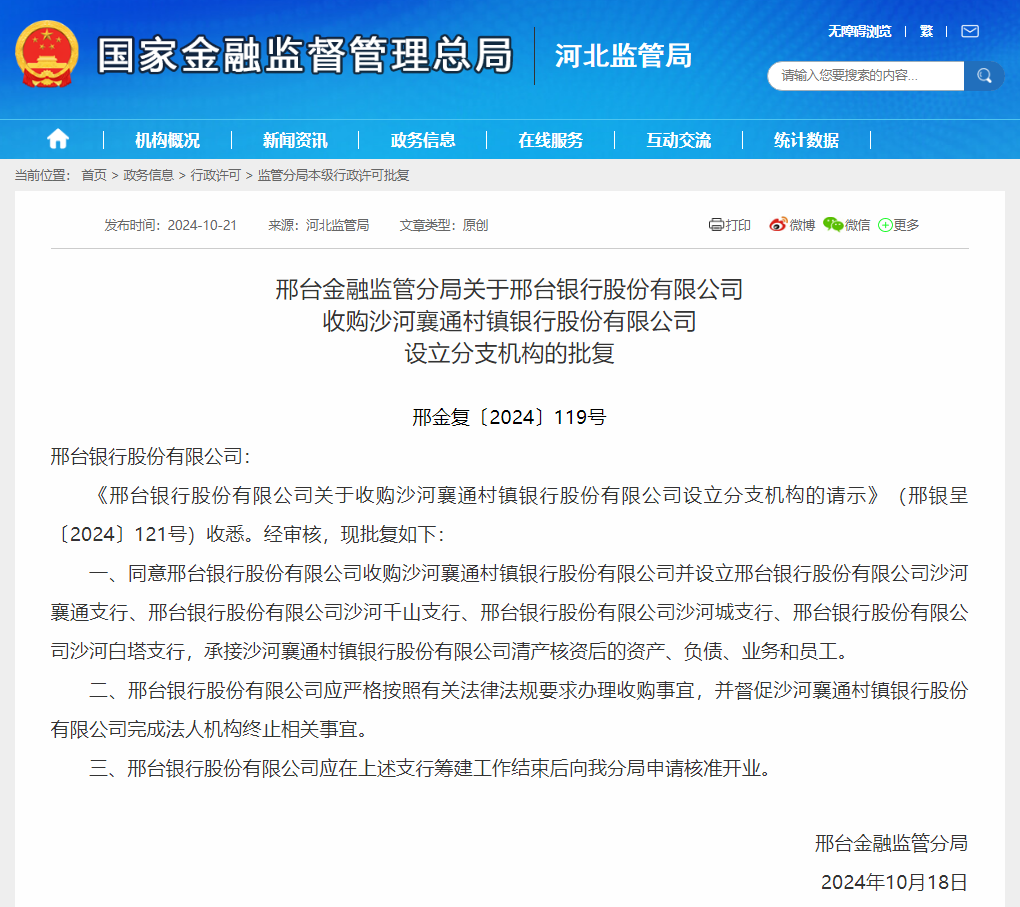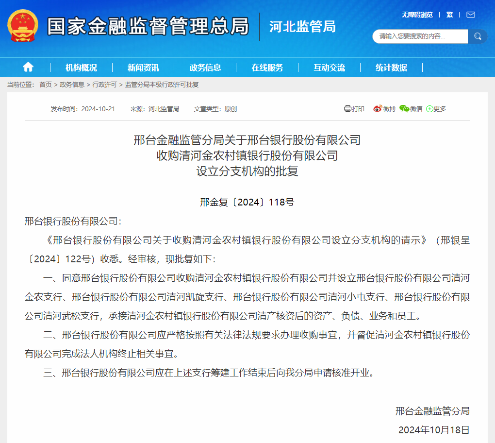 具体来看,邢台银行获批收购清河金农村镇银行,并设立邢台银行清河金农支行、邢台银行清河凯旋支行、邢台银行清河小屯支行、邢台银行清河武松支行,承接清河金农村镇银行清产核资后的资产、负债、业务和员工。