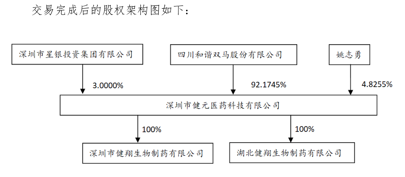 交易完成后,四川双马持有深圳健元92.1745%的股权,星银集团持有深圳健元3.0000%的股权,自然人姚志勇持有深圳健元4.8255%的股权。此次交易实施完毕后,深圳健元成为公司合并报表范围内的控股子公司。该交易不构成关联交易,且不构成重大资产重组。该交易事项不需要经过公司股东大会或有关部门批准。公司十二个月内也不存在与本次交易标的相关的资产购买交易。