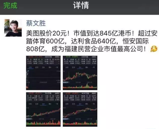 在股价的助推下,美图公司的市值也一路走高,20日盘中一度突破900亿港元,董事长蔡文胜还在朋友圈记录下了这“昙花一现”,并称美图已成为“福建民营企业市值最高公司”,美图的一位高管也在此时表示,“美图会充分利用好各种资源,尝试着用结合AI的产品,让世界变得更美。”