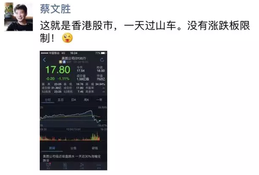 但大佬们的喜悦十分短暂,发完朋友圈一个多小时之后积累的涨幅就被吞没,并出现了暴跌。也许是为了给早些时候的“市值直播”一个交代,蔡文胜在收市前再次更新了朋友圈: