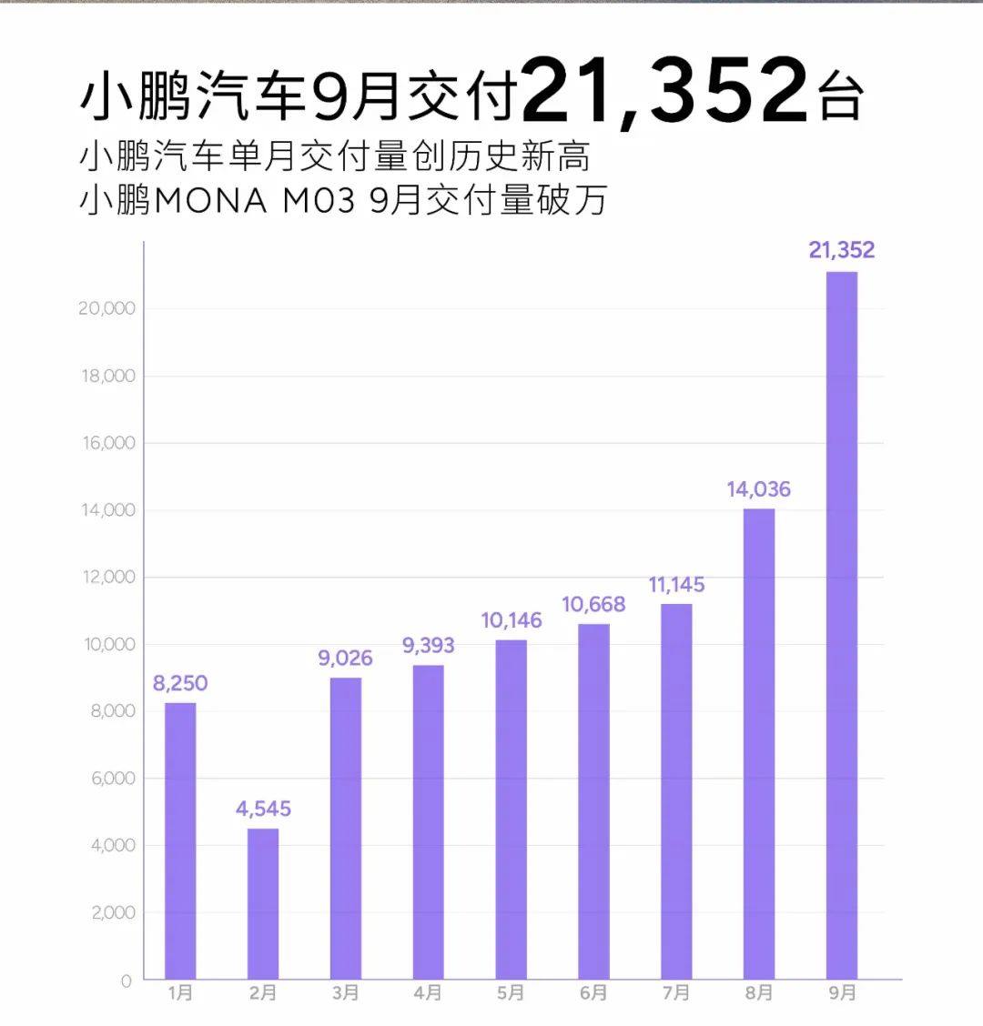 从目前的局面来看,小鹏MONA M03已经在上市首月完成了为小鹏汽车拉销量的任务。2024年9月,小鹏MONA M03交付破万台,同期,小鹏汽车共交付新车2.1万台,同比增长39%,环比增长52%,创单月交付历史新高。