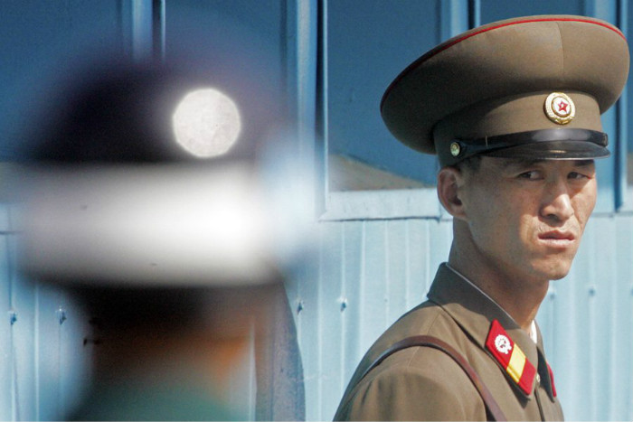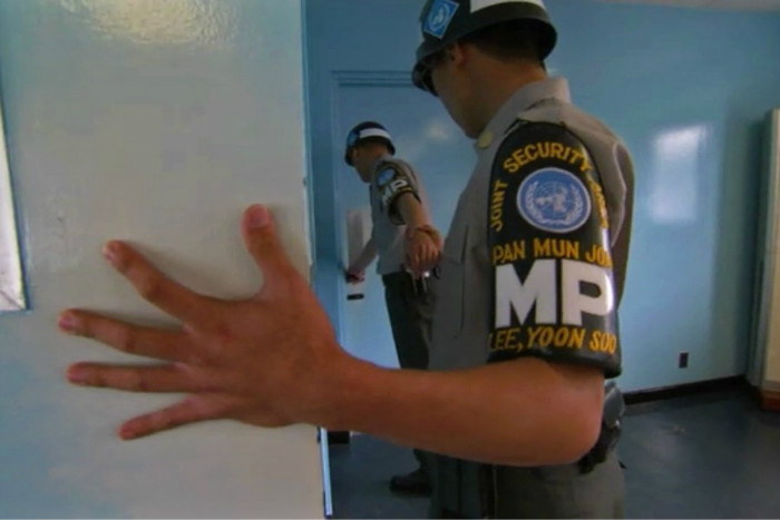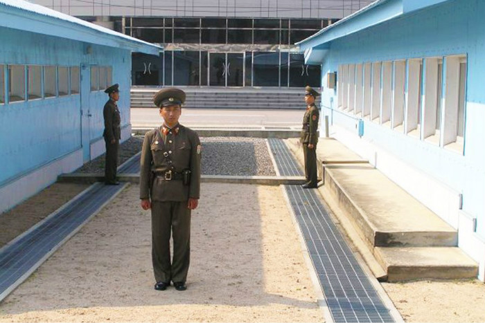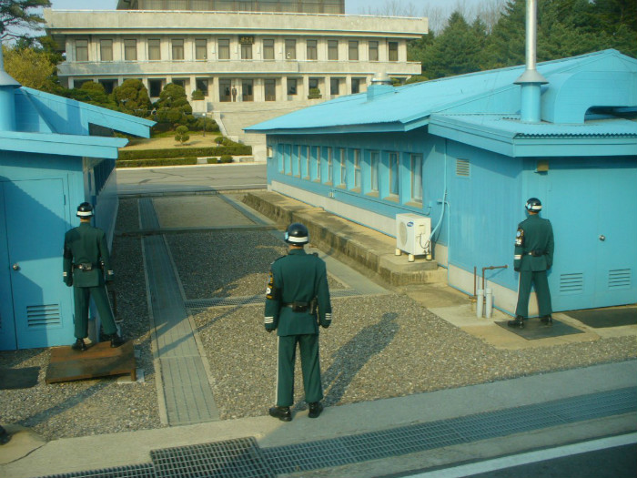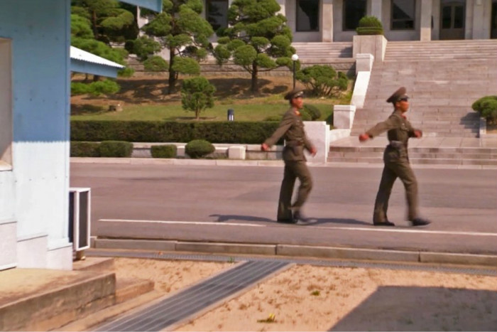 对面站立的则是三名朝鲜士兵。有传言说,他们之所以互相保持面对面,是为了防止有人逃往南边。