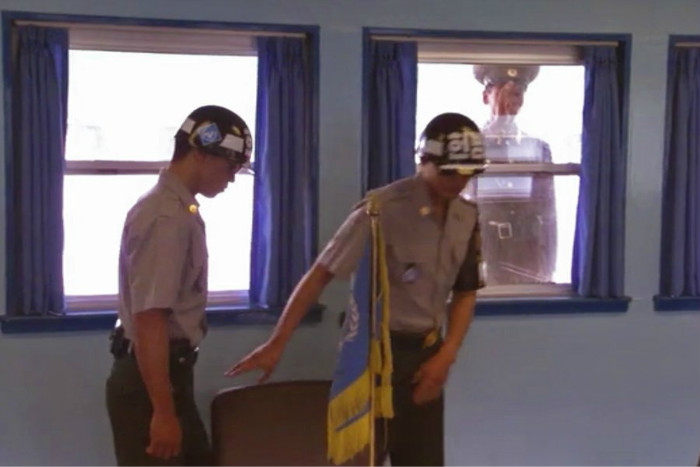 当韩国士兵入内时,朝鲜士兵就会在窗外监视。