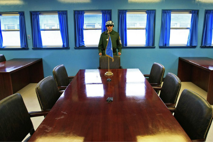 在这间小屋里,游客可以绕会议桌转一圈,然后就可以说自己到过朝鲜和韩国了。