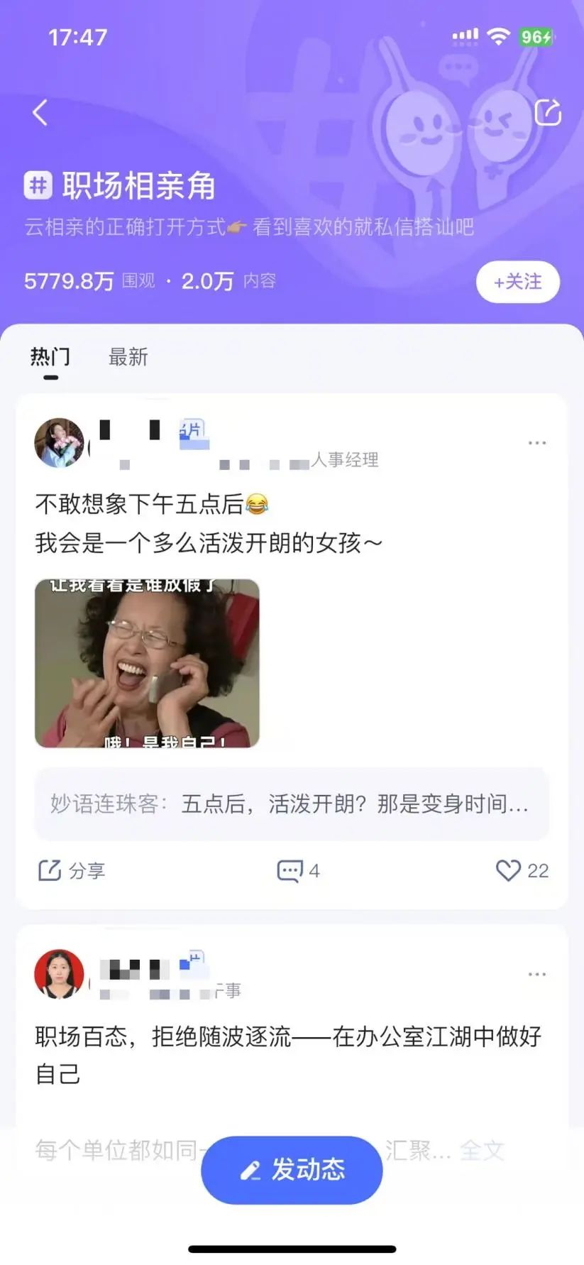长久以来,招聘软件脉脉社区中不乏“蹲一个男/女友”的相亲贴,平台甚至內植“大厂相亲角”,目前,大厂相亲角已升级为小程序,功能更为齐全。智联招聘则祭出职场相亲角,截至目前已获5779.8万围观和2万条内容。