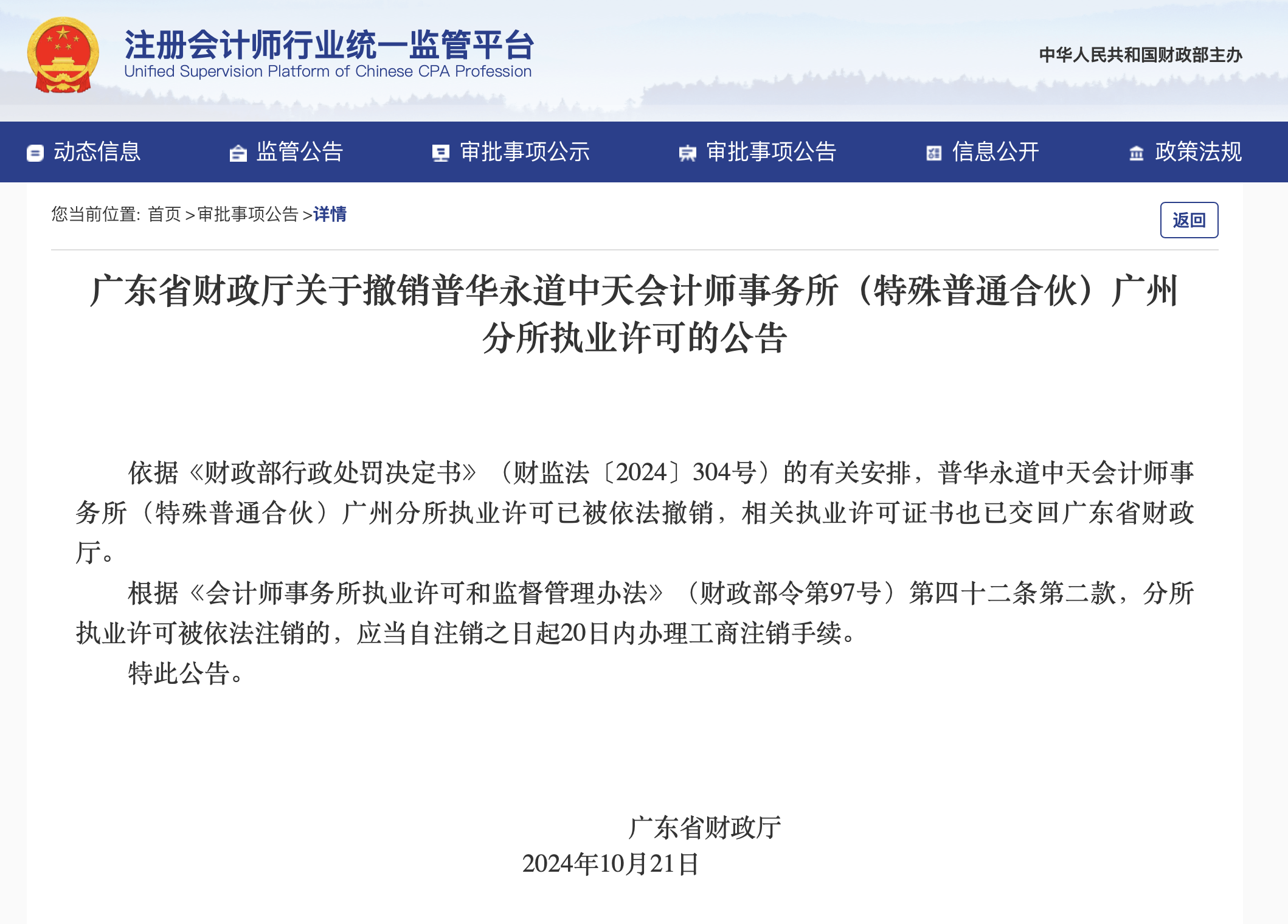 10月22日,注册会计师行业统一监管平台披露广东省财政厅关于撤销普华永道中天会计师事务所(特殊普通合伙)广州分所执业许可的公告。